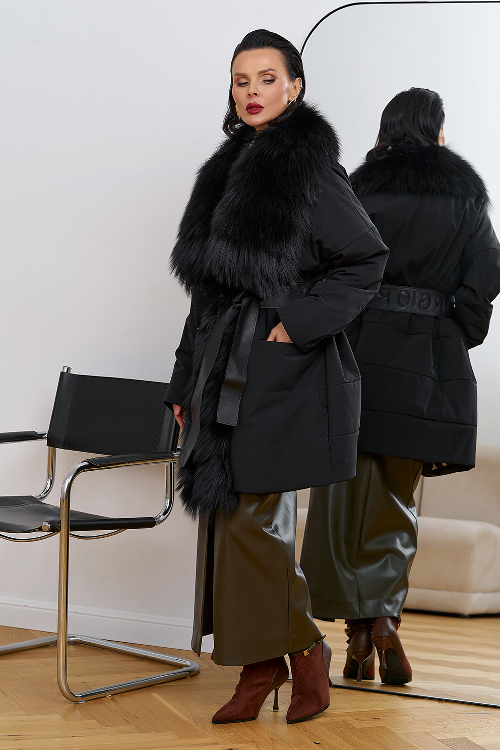 Вид застежки - кнопки, брендированный пояс из натуральной кожи