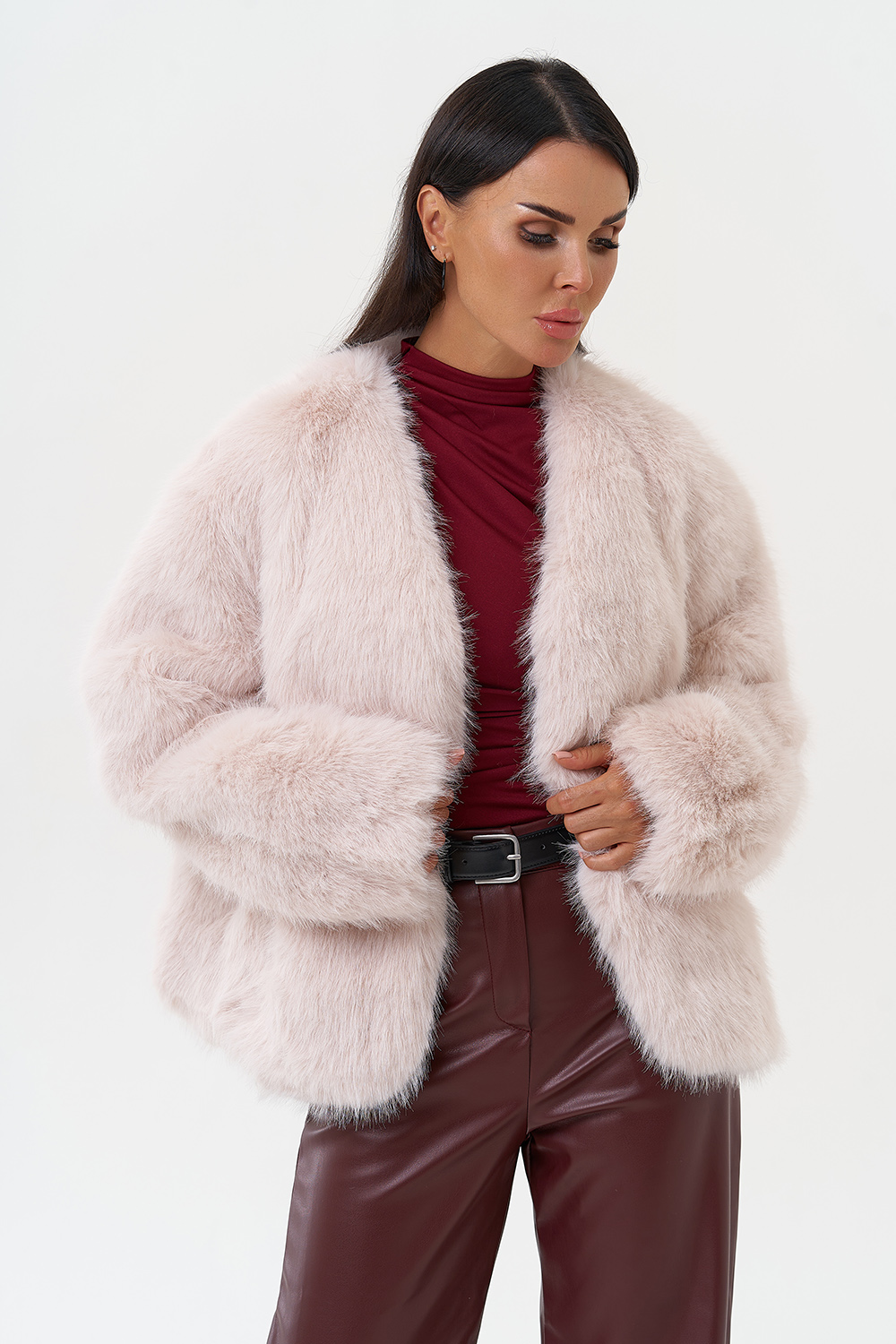 Фасон - прямой Длина изделия - 60 см Цвет - розовый (персиковый) Материал - экомех Состав полотна - полиэстер 100% Подкладка - полиэстер 100% Вид застежки -крючки, пояс Вид ворота - V-образный Фасон рукава - спущенное плечо, длинный |